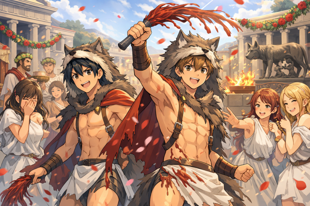これは古代ローマに存在したお祭りで、ローマ神話の女神様「ユーノー」と「マイヤ」(それぞれ結婚や豊穣を司る女神)を崇拝するお祭りで、毎年2月15日に行われていました。