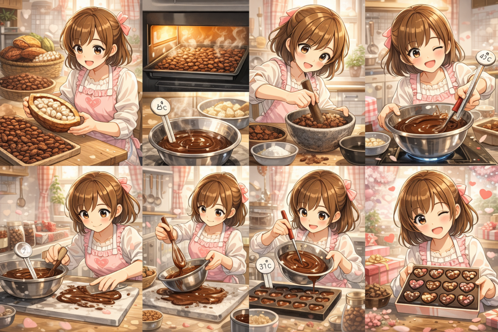 chatgptが描いたチョコの作り方、アニメ風(3枚目から6枚目まで同じやし、最後ビーズでも入れたんか?そして謎の温度表示)